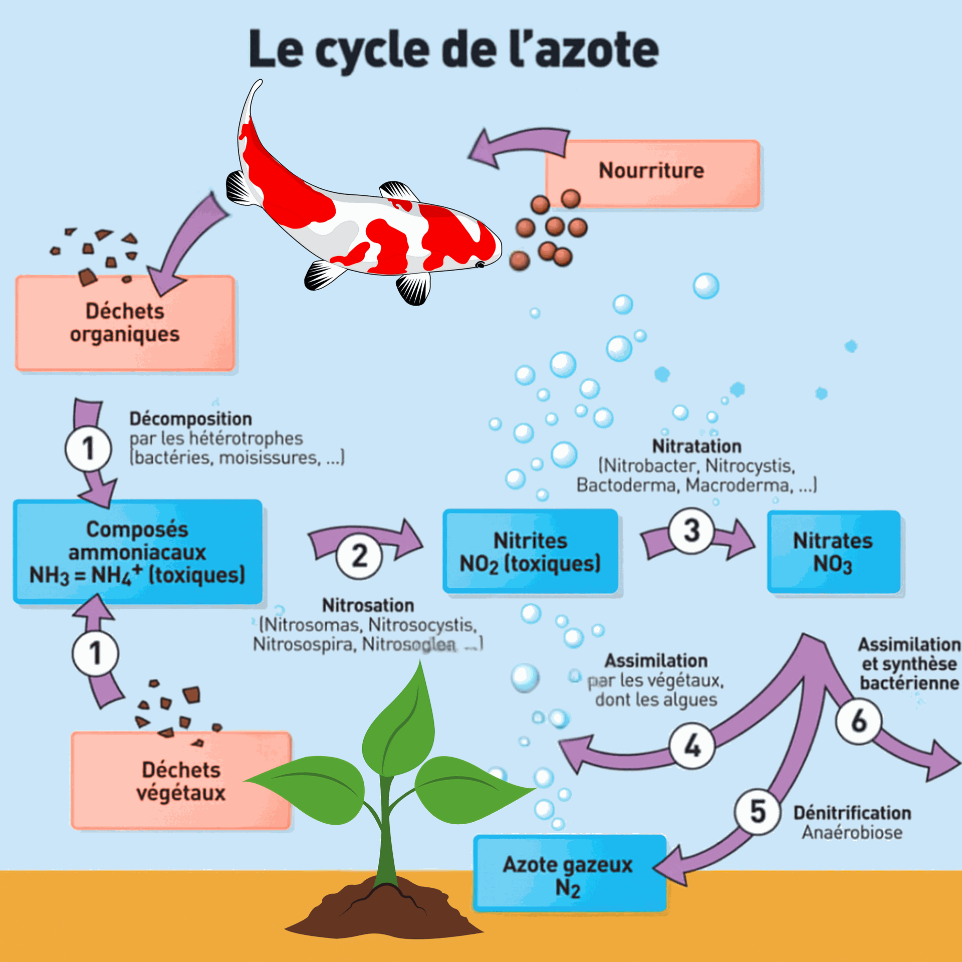 Le cycle de l’azote permet de gérer les déchets produits par les poissons et autres organismes vivants du bassin.
