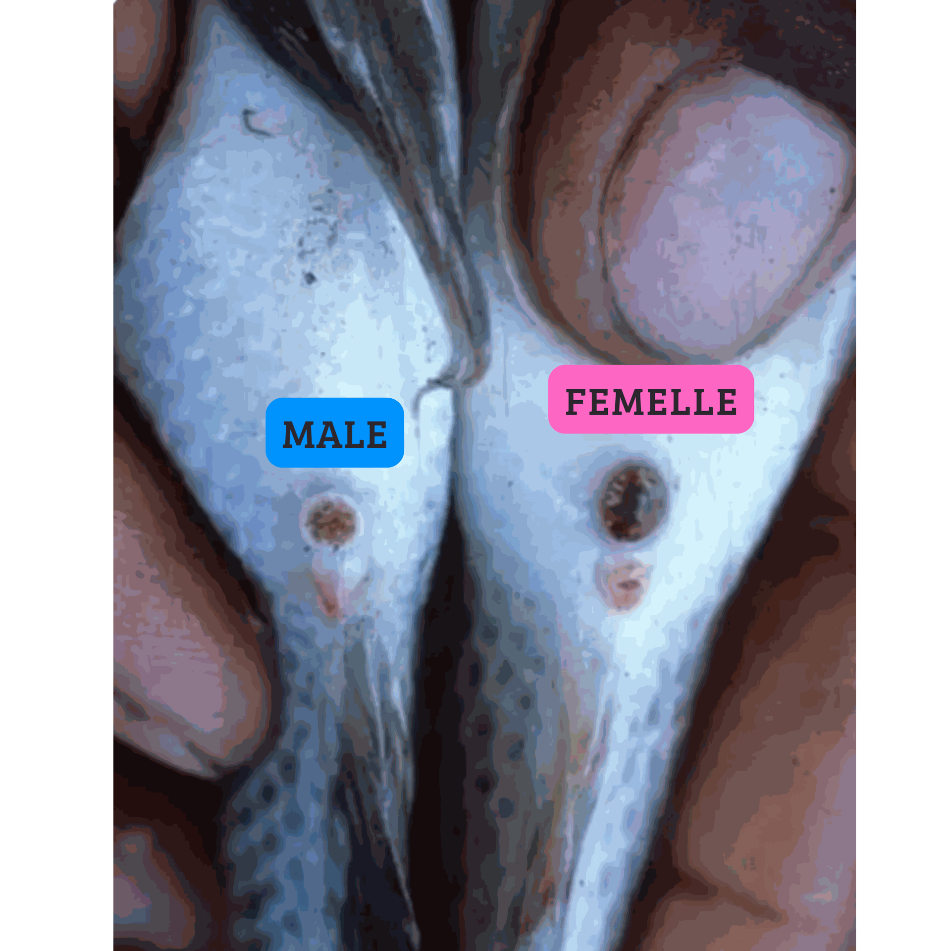 Chez la femelle : nageoires larges, arrondies et plus ou moins transparentes.